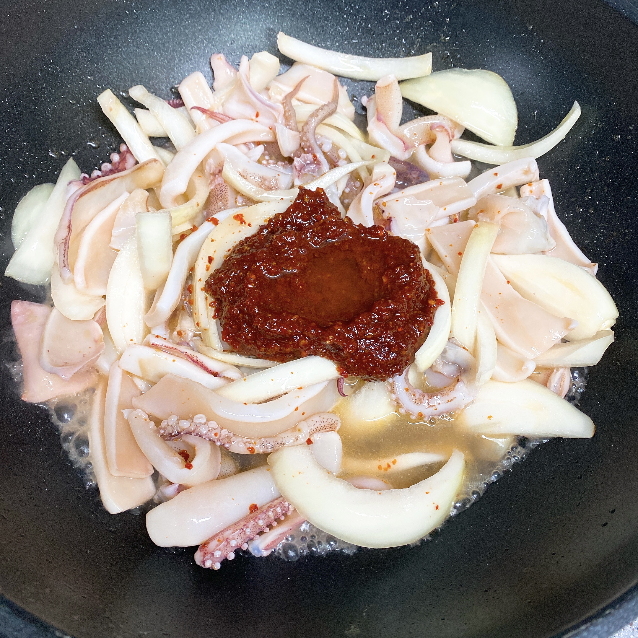 양파가 노릇해지고 오징어가 슬슬 하얘질때까지 재료들을 볶아주세요.