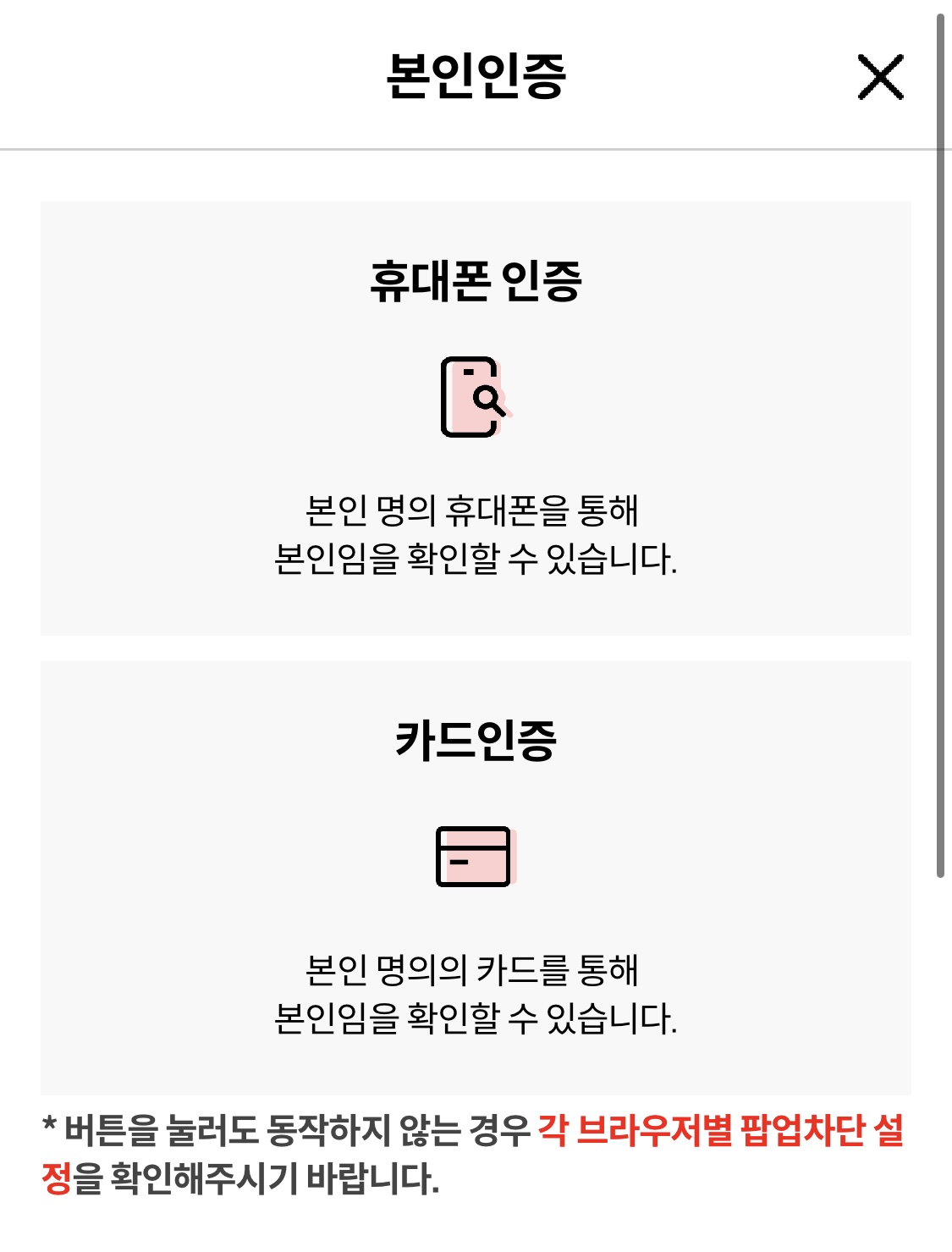 본인인증은 휴대폰 또는 카드인증으로 쉽게 가능합니다.