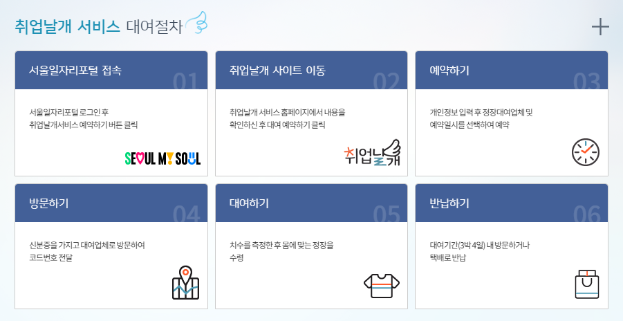 취업날개 사이트에 접속하여 개인정보 입력 후 정장대여업체 및 예약일시를 선택하여 예약합니다.