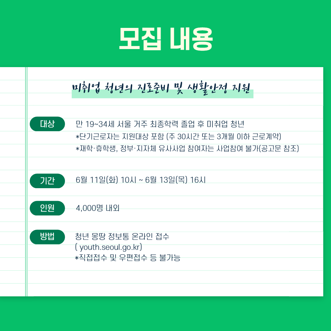✅ 지원대상 : 만 19~34세 서울 거주 최종학력 졸업 후 미취업 청년 (자세한 사항 공고문 참조)