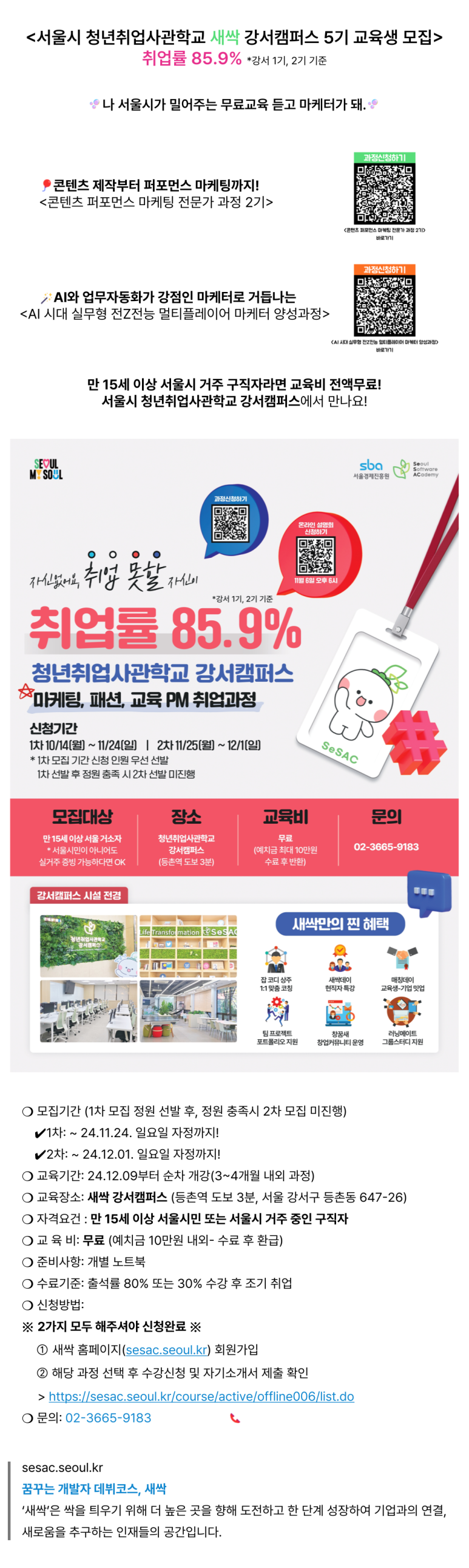 | 청년취업사관학교 금천/성동/광진캠퍼스 교육생 모집 (7) | 2024.11.01 |