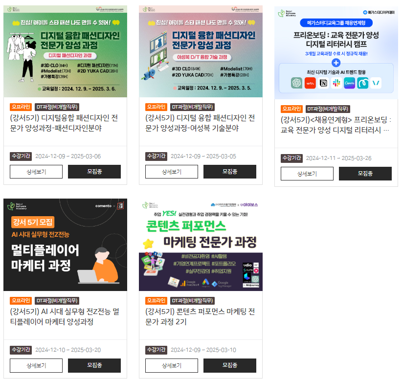 이번 5기의 교육과정에는 마케팅, 패션, 교육 PM 취업과정이 준비되어 있는데요