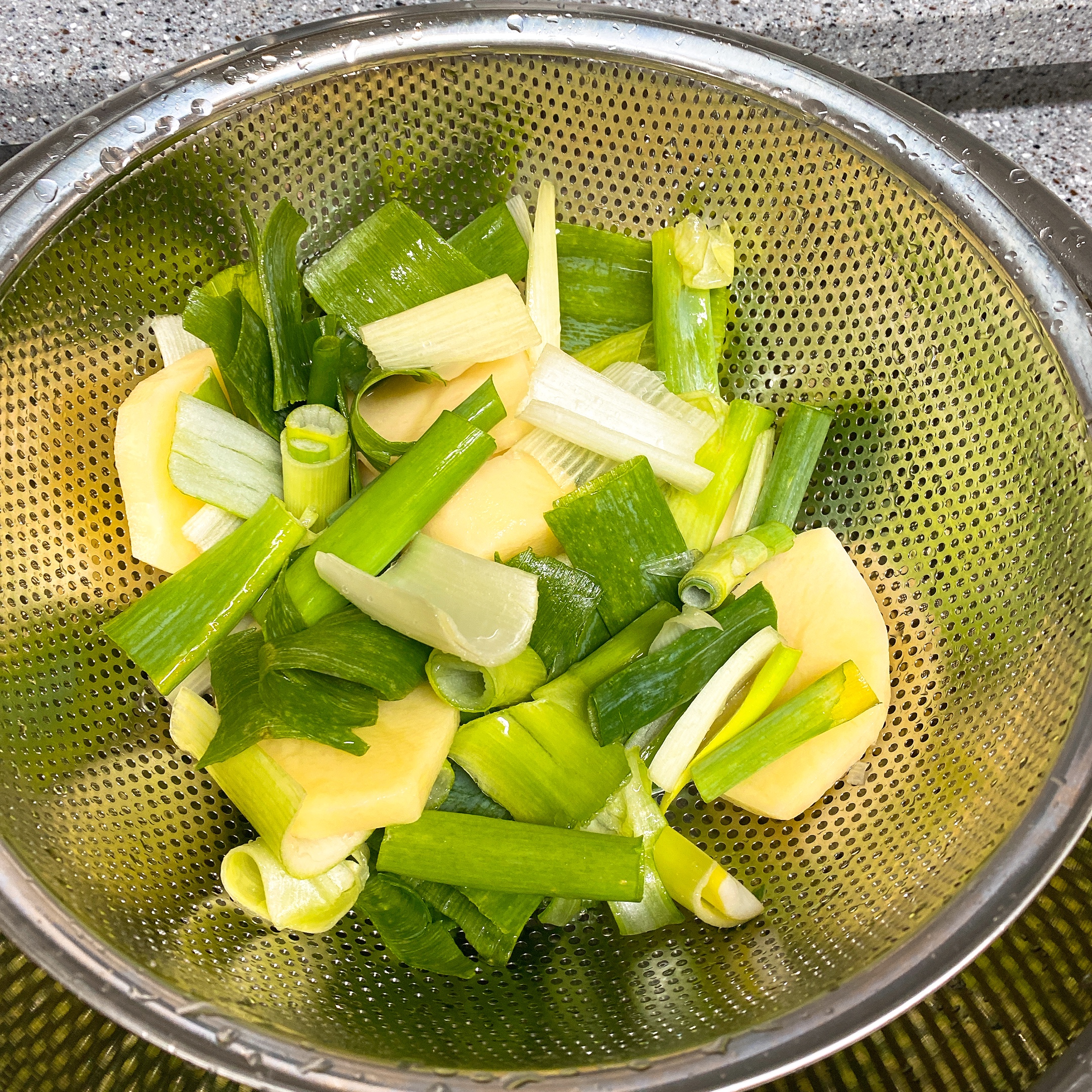 그 후에 미리 씻어둔 대파와 감자를 넣고 감자가 익을때까지 끓여주세요.